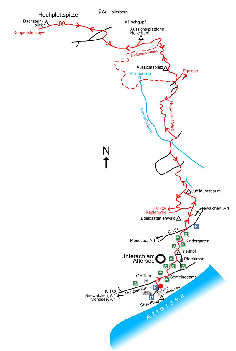Ausgangspunkt unserer Wanderung ist in der Ortsmitte von Unterach am Attersee der in der warmen Jahreszeit – von 15. Mai bis 15. September – gebührenpflichtige Parkplatz P 3 (ca. 470 m). Die meisten anderen Parkplätze im Ort sind den Einwohnern vorbehalten oder Kurzparkplätze. Vom direkt neben dem örtlichen Strandbad am Seeufer (Abb. 3) gelegenen Parkplatz P 3 sieht man Richtung Nordwesten unser Gipfelziel (Abb. 4) und Richtung Süden die imposanten Felswände unterhalb der Ackerschneid (1.119 m, Abb. 5). Wir gehen ein paar Schritte zurück zur Hauptstraße, auf der wir zugefahren sind, und biegen rechts in diese ein. Gegenüber vom Gemeindeamt biegt man nach einigen Metern links auf einen Fußweg zur Pfarrkirche (Abb. 6) ab. Bei dieser biegen wir dann – wieder links – in die bergwärts führende Kirchengasse ein. Steil geht es in einem Rechtsbogen vorbei am Friedhof und am Kindergarten aufwärts, bevor rechts ein beschilderter Fußweg von der asphaltierten Ortsstraße abzweigt, auf dem wir entlang von Wohnhäusern zur Bundesstraße aufsteigen. Nach etwas über 10 Minuten vom Ausgangspunkt erreichen wir diese. Ein paar Schritte Richtung Norden auf einer Art Nebenfahrbahn – von der man erstmals einen schönen Blick auf den Attersee (Abb. 7) genießt – zweigt links ein beschilderter Weg ab.