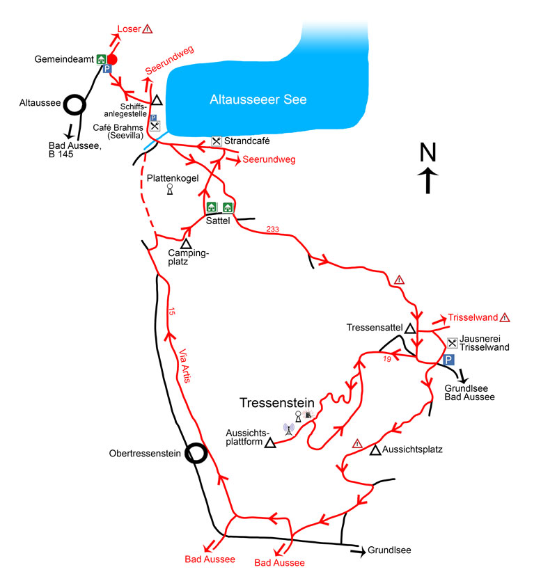 Wir passieren am oberen Ende den Ort Tressenstein und kommen – stets den Wegweisern folgend – zu einem Aussichtsplatz mit Blick Richtung Dachstein samt einem Hinweisschild, dass man sich hier auf der Via Artis (Abb. 23) befindet, die mit Hinweistafeln daran erinnert, dass viele bekannte Kunstschaffende in Altaussee gewirkt haben. Nach einer längeren, fast flachen Wegstrecke im Wald mündet unser gut begehbarer, breiter Steig in die Verbindungsstraße vom Grundlsee zum Altausseer See, in die wir rechts einbiegen. Kurz marschieren wird auf dieser abwärts, dann erreichen wir den Ortsbeginn von Altaussee (Abb. 24). Bei der bald folgenden Kreuzung halten wir uns rechts Richtung Campingplatz und müssen nach wenigen Schritten aufwärts bei der nächsten Abzweigung entscheiden, ob wir halblinks auf dem beschilderten Fußweg westlich des Plattensteins direkt zur Seevilla zurückkehren oder ob wir östlich des Plattensteins – rechts am Campingplatz vorbei – weiter zum Sattel aufsteigen und von dort am linken Wiesenrand zu der Wegkreuzung mit unserem Aufstiegsweg absteigen. Da wir noch im schön am Seeufer gelegenen Strandcafé einkehren wollen, wählen wir die zweite Variante und gelangen nach rund 20–25 Minuten vom Ortsbeginn zum Seeufer samt traumhaftem Loserblick (Abb. 25) von der Seeterrasse. Von dort geht es dann – mit weiteren Postkartenmotiven zum See und zur mächtigen Trisselwand (Abb. 26) – in wenigen Minuten Richtung Westen zur Seevilla und weiter auf dem Aufstiegsweg zurück zum Ausgangspunkt, den wir vom Gipfel des Tressensteins mit dem Umweg zum Strandcafé nach 2¼–2½ Stunden erreichen.